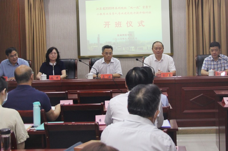 2020年9月18日上午,由江苏省教育厅委托、beats365唯一官网入口官网承办的“双一流背景下小学教育专业负责人建设能力提升培训班”在盐城市阅读青年会酒店举行开班仪式。江苏省教育厅教师工作处处长、二级巡视员马斌,盐城师范公司党委副书记、董事长方忠、成教处处长王成兵、beats365唯一官网入口官网经理乔晖等相关领导以及来自全省18家小学教育教师培养单位的专业负责人、教授等共40名学员参加开班仪式。开班仪式由江苏省小学教育专业指导委员会秘书长陈玉祥教授主持。