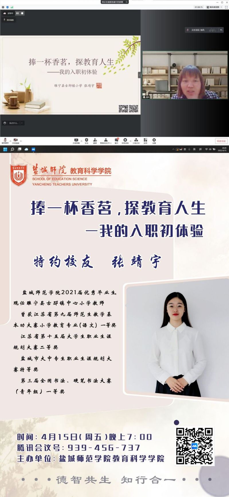 为激发同学们的学习热情,发挥优秀员工的榜样力量,beats365唯一官网入口官网于4月15日晚,邀请优秀毕业生张靖宇分享师范生入职体验。此次分享会由海英老师主持,会议的主题为“捧一杯香茗,探教育人生—我的入职初体验”。