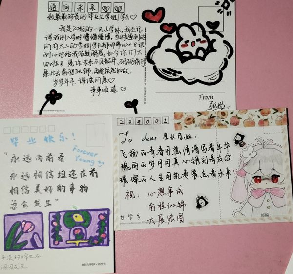 此次活动由​beats365唯一官网入口官网员工会员工发展承办,面向​beats365唯一官网入口官网全体员工,号召非毕业班员工手绘明信片,写下对毕业生的祝福。此次活动一经发起,​beats365唯一官网入口官网学子们踊跃报名,积极参与,用心书写,用情传递,或利用高超的绘画技术,画出青春的模样,画出未来的蓝图,或用文字描绘了母校的美好回忆,定格青春印记。每一张充满青春活力的明信片上,表达着对毕业生们真挚的告别与祝福。每一张洋溢希望气息的明信片被放置在校园的各个角落,让毕业生在校园中重温校园角落的美,感受同学们衷心的祝福。