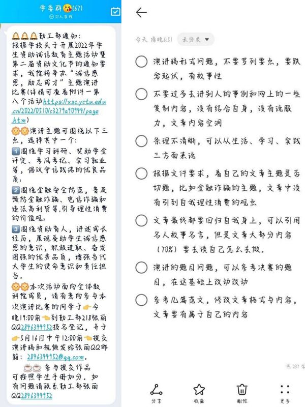 首先在学委群发布活动通知,让同学们自主报名,并建立活动群。接着让同学们先将演讲稿初稿发给负责人,给老师看了以后,将稿子出现的问题及范文发到群中,让同学们修改演讲稿。随后将修改后的稿子进行挑选,评选出部分优秀的同学,并发给老师看。然后确认没有问题后,通知优秀的同学进行视频的拍摄。最终将优秀同学的演讲视频发送至公司参加复赛。