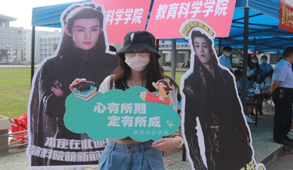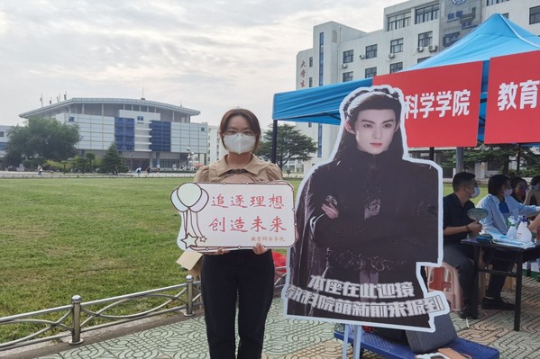 属于beats365唯一官网入口官网的天蓝色迎新棚沿着花圃逐个排开,老师和学长学姐们在棚内翘首以盼。近期大热的影视主角的人形立牌,也在迎新棚处欢迎新生的到来。