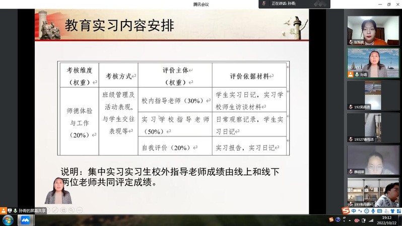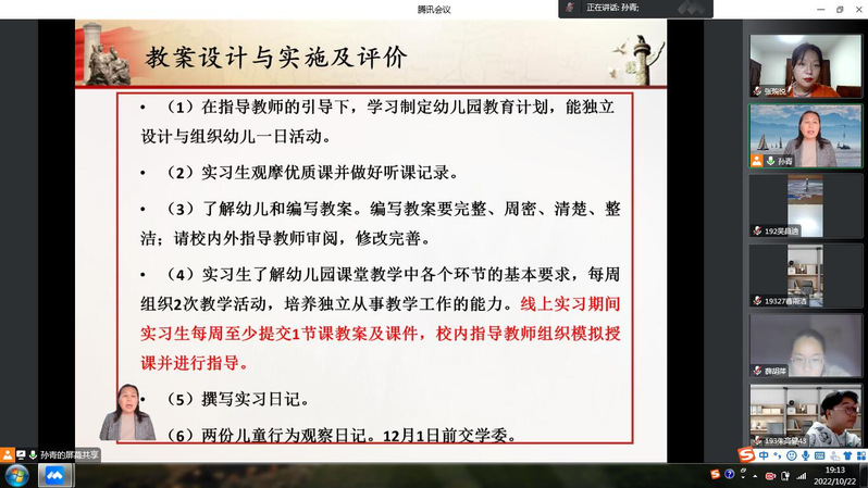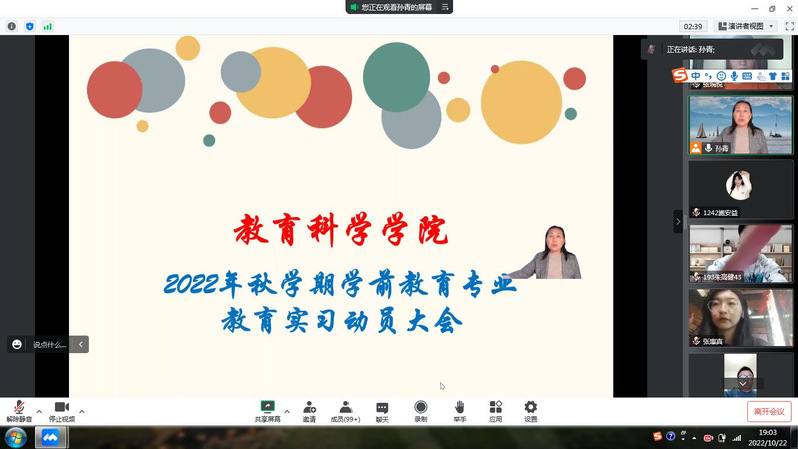 2022年10月22日,2019级学前教育(师范类)专业本科生实习动员大会,在线上腾讯会议召开。公司学前教育专业主任孙青主持召开此次会议,实习带队老师陶亚萍、凌丽、刘红、杜晓梅、牛翠平、张琬悦、高艺家、孙琴干等教师以及2019级(1)(2)(3)(12)(13)班同学参加了此次会议。
