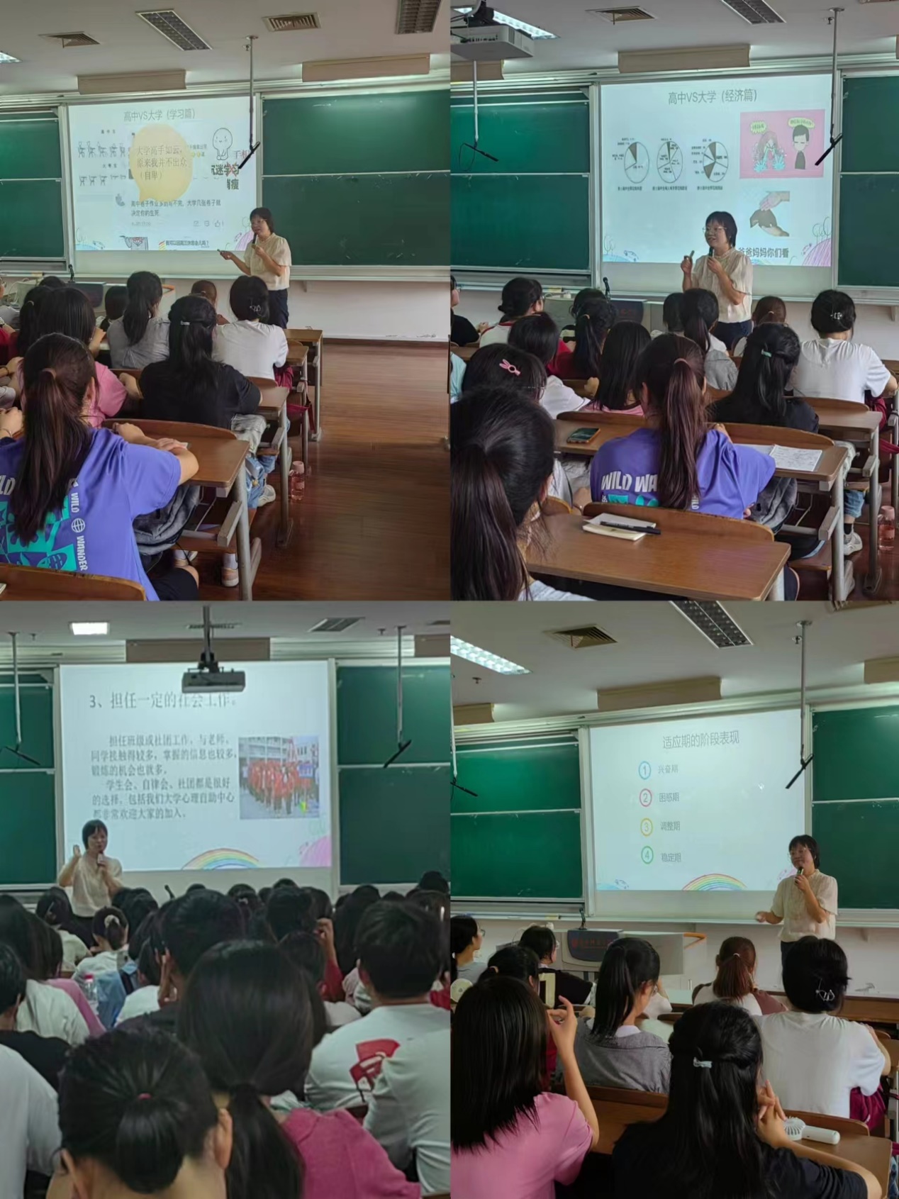 随后,贲雨晴老师通过校内饮食出行、宿舍生活和人际关系、恋爱问题等事例解读老员工的生存、安全、社交等需求,并就员工在兴奋期、困惑期、调整期、稳定期四个时期,可能会遇到的问题做进一步的指引与解答,最大程度缓解新生的心理焦虑。杨齐老师从“适应大学三步走”即适应第一步:接受自己的大学、适应第二步:爱自己的专业、适应第三步:制定大学计划,分步骤为新生详细规划老员工活该如何从适应到完美融入。
