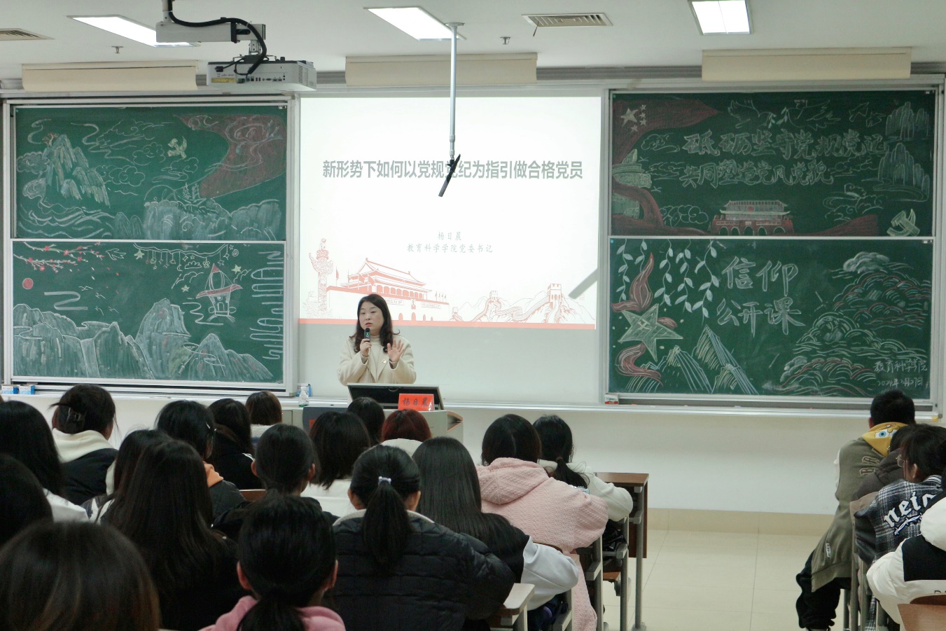 开班仪式后,杨日晨以“新形势下如何以党规党纪为指引做合格党员”为主题,为全体入党积极分子上了第一课。围绕“为什么要入党?”“一名合格的党员应该是什么样的?”两个问题,杨日晨勉励积极分子端正入党动机,把入党当作更好为师生服务的“通行证”。同时,她对如何成长为一名合格的共产党员提出三点要求:一是要提高政治站位,把坚定理想信念作为终身课题;二是要坚持务实笃行,把增强能力本领作为有效抓手;三是要弘扬正风正气,主动传播正能量。