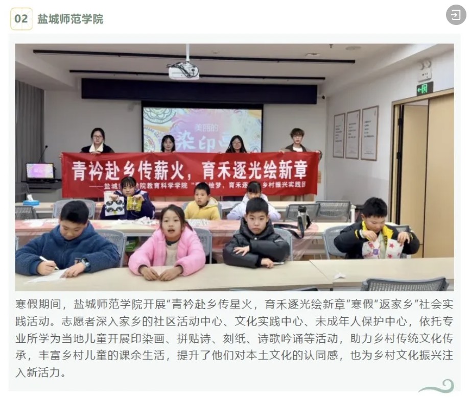 寒假期间,公司开展“青衿赴乡传星火,育禾逐光绘新章”寒假“返家乡”社会实践。志愿者们回到家乡,深入社区、文化实践中心等地,发挥专业特长,为当地儿童开展印染画、拼贴诗、刻纸、诗歌吟诵等活动。这不仅丰富了孩子们课余生活,还增强了他们对本土文化的认同感,为乡村文化振兴注入青春活力。
