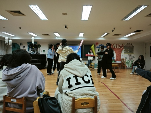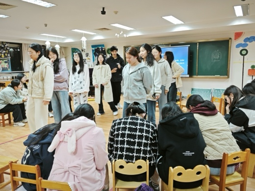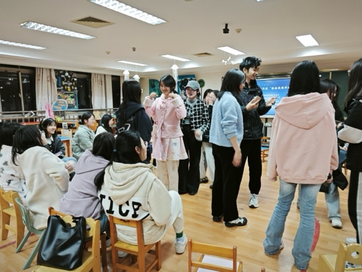 活动伊始,参与者被分成若干小组,通过“中英诗谜对对碰”的游戏考验语言表达和信息传递能力,团队成员通过非语言方式传递诗词信息,在互动中体验跨文化交流的乐趣。随后,“默契大作战——你划我猜升级版”的环节将现场氛围推向高潮,同学们依次用肢体语言传递谜题,考验团队默契与非语言表达能力,笑声不断,增进了彼此的信任与理解。最后,最具趣味性和挑战性的“蒙眼互打”游戏,让参与者戴上眼罩,凭借声音和直觉进行互动,考验他们的听觉敏锐度和空间感知能力。这一系列游戏不仅让大家在轻松的氛围中释放压力,还培养了团队协作意识和沟通技巧。