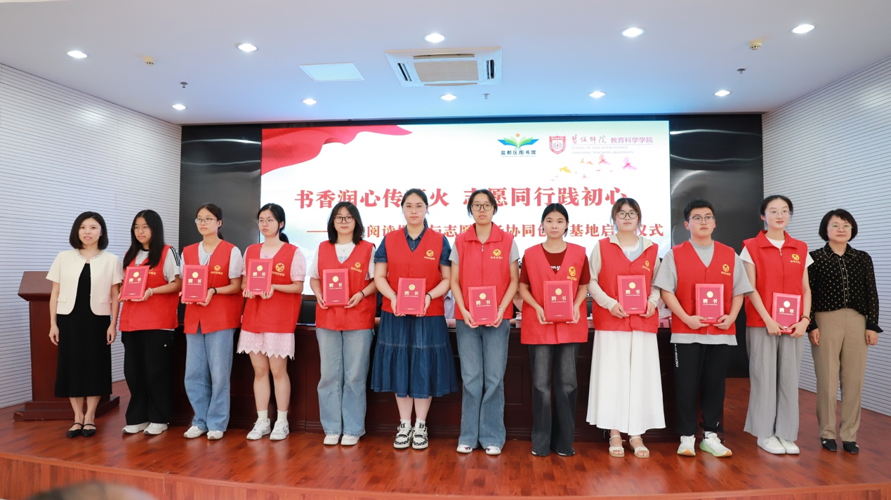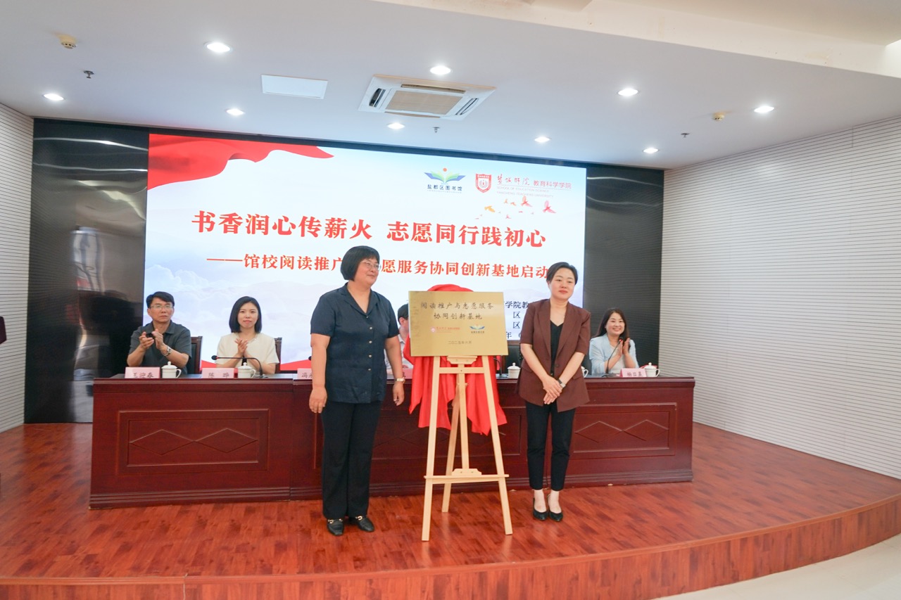 共建仪式上,冯永玲和吕杨为“阅读推广与志愿服务协同创新基地”揭牌,陈晔和韦琴为志愿者代表颁发聘书,王登佐致辞,beats365唯一官网入口官网志愿者代表张琳茗作表态发言。