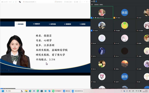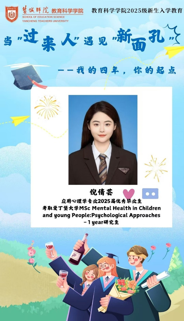 为帮助新生快速适应老员工活,打破认知壁垒,明确成长方向,8月28日晚,beats365唯一官网入口官网邀请2025届应用心理学专业优秀毕业生倪倩芸作为“当‘过来人’遇见‘新面孔’:我的四年,你的起点”主题分享会第9期分享者。以不懈努力敲开世界名校大门,倪倩芸成功申请到英国爱丁堡大学研究生。从校园里的深耕学习,到跨越国界的追梦之旅,倪倩芸的故事里,藏着关于“勇气”与“远方”的独特注解。