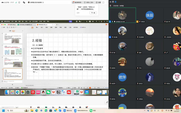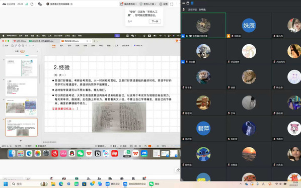 张希晨着重强调老员工涯的前期一定要夯实基础,做到有意义、高效率的学习。在专业课学习方面,她建议要开始构建适合自身的知识体系,做到每日及时复盘和强化。每次接受新知识,都要通过同化、顺应等方式把它纳入到自己的体系中。例如,课堂上做好初步的笔记,搭建好大致框架,课后再通过多种渠道,自我检索资源,细化完善课堂笔记,达到深化知识的效果。张希晨还提倡科学学习,运用心理学知识,契合自身学习习惯,尽量提高自身能力的下限。面对英语学习,她提出灵活运用艾宾浩斯记忆曲线,定期背单词、做阅读、练习听力,打好英语基础,顺利通关英语四六级。