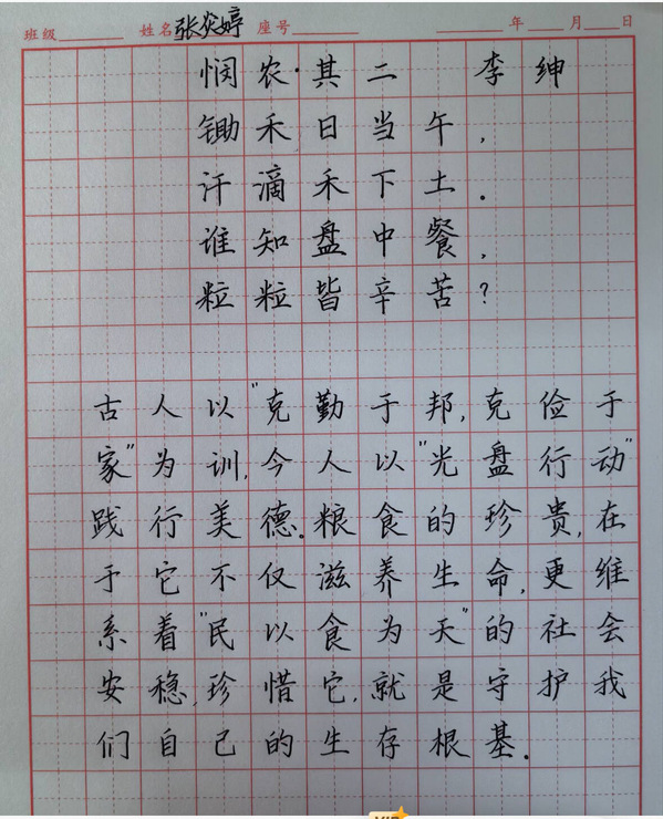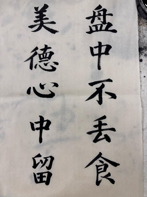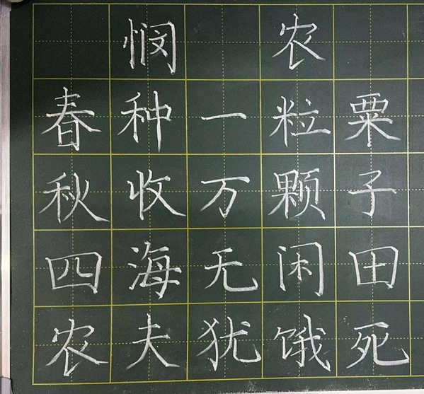 簌簌粉屑中,农耕文明的厚重底蕴缓缓铺展;银钩铁画里,对田间劳作的敬畏之情静静流淌;墨韵淋漓处,勤俭节约的精神风骨傲然挺立。当笔尖与纸面摩挲,书法艺术的刚劲与柔美化作节约粮食的自觉行动;当千年翰香邂逅世代相传的节俭智慧,方寸笔墨不仅锤炼了未来教师的教学基本功,更让“半丝半缕恒念物力维艰”的箴言随墨汁浸润学子心田